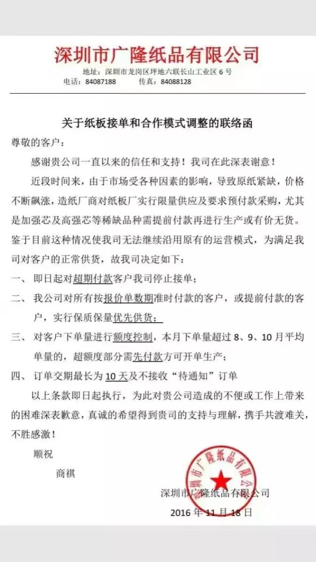 11月19号我不知道别的地方,我知道深圳的原材料紙張漲瘋瞭,一時間所有的包裝行業印刷行業朋友圈都在轉發,我開始憤怒瞭這是要逼著印刷廠都關門嗎?對你們有好處嗎原材料的廠商,你們不想讓我們接單瞭想讓我們斷糧食瞭,沒有紙的日子特别難熬,漫天飛的漲價聯絡單與限産單通知,沒有紙的日子特别難熬,爲什麽說紙價瘋漲也沒人管?並不是要故意制造恐慌,也不是要哄擡紙價。就幾天時間公司接到好幾張漲價的通知單,我說如果你告訴客戶他們肯定不願加他的價,這樣的話我們印刷廠就不好接單不好操作,你不可能一一的爲你的客戶去解釋吧,就算他們願意聽我們也沒那麽多時間,換個角度如果印刷廠集體罷工的話,那你們紙廠還有什麽資格是合夥漲價,本身今年明年印刷行業都是很困難的,這個雪上加霜的時候還漲價都不知道報的什麽心态。反正我是有圖有真相的等會有同行的可以看看,大家互相轉發抵制他們原材料漲價。深圳市博霖印刷感謝一路支持的客戶和供應商們特殊時候換位思考謝謝。