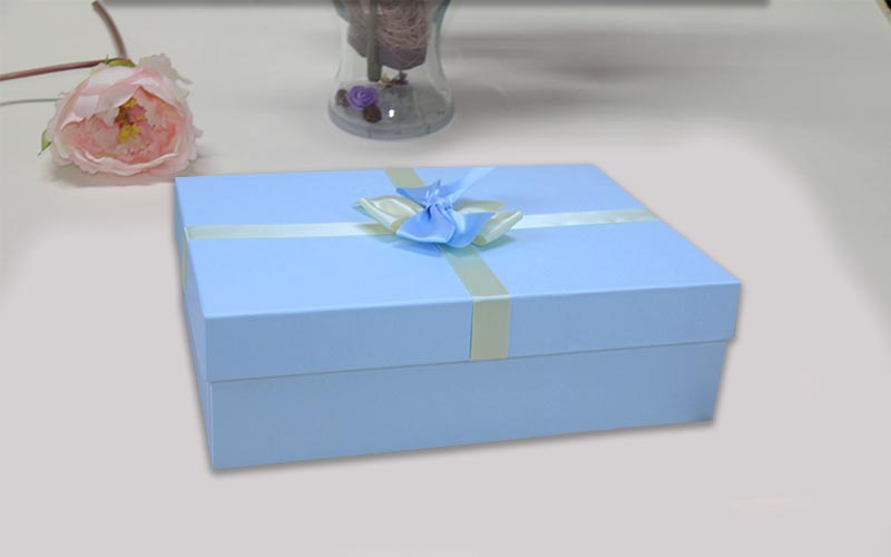 1.材質:盒子面紙特種紙空白有紋路的紙張,裱1500G雙灰闆底盒跟天盒一樣的材質做工 ,盒子表面年各種顔色絲帶。此款服裝包裝盒爲各種通用款式機器批量制作。