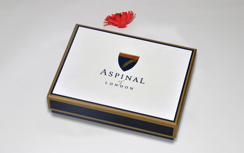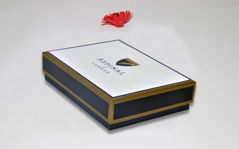 1.材質:盒子面紙用白色觸感特種紙,表面印刷燙金文字LOGO,裱1500G雙灰闆裏面的所有内襯都是藍色特種紙,上盒四邊印專金,整款盒子機械化制作。
