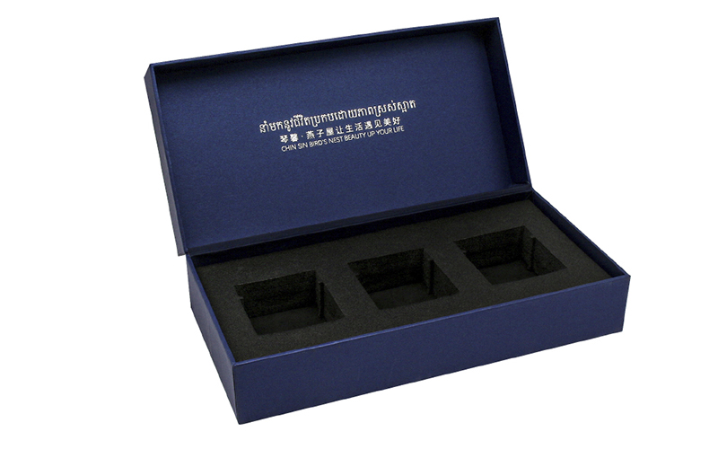 這是一款藍色特種紙的燕窩包裝盒,灰闆採用非常硬實的立格闆。盒型是一對上蓋跟下蓋同樣大小翻蓋盒,内托選用的是高密度的珍珠棉,效果全面趕超eva跟海綿。改盒型适用於瓶裝的燕窩保健品等,用瞭這個禮盒保證可以讓您的産品提升一個檔次!如有需要定制禮品盒均可咨詢博霖印刷!