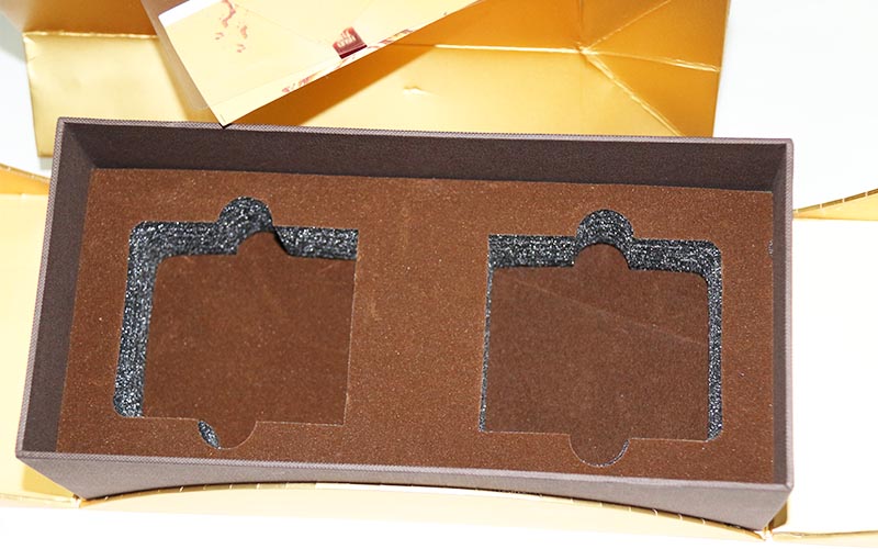 1.材質:盒子表面用金卡紙,表面絲印盒燙紅金文字,過啞膠裱1800G雙灰闆,盒内放植絨珍珠棉,盒型爲雙開門翻蓋盒,盒内配一套說明書系列在單獨配一個手提袋,盒子純手工制作