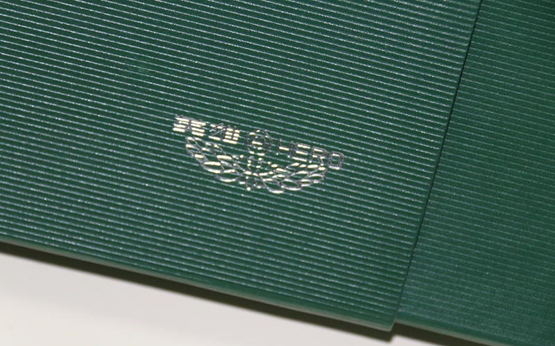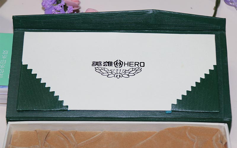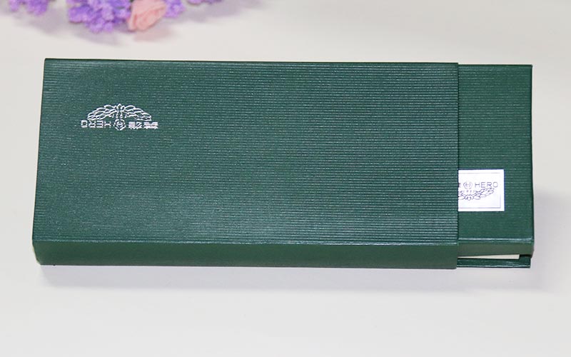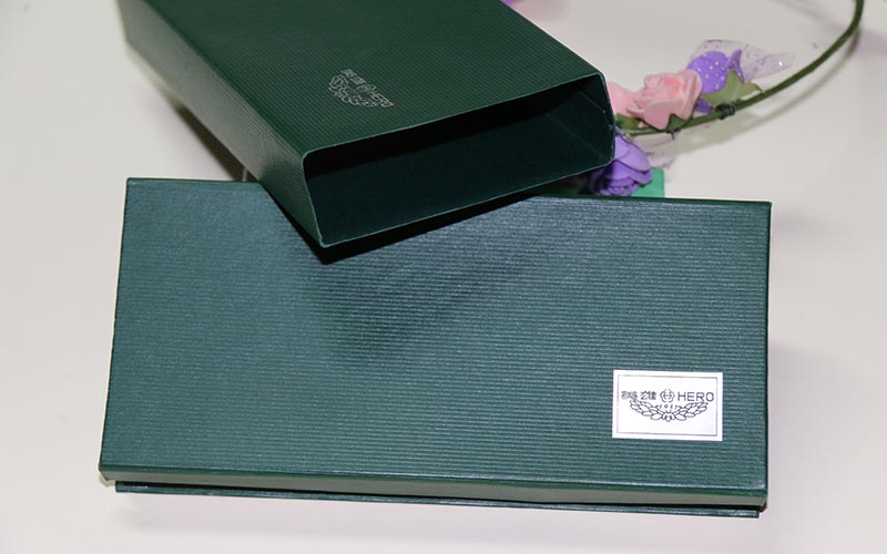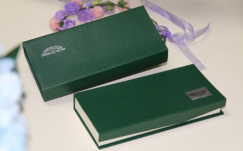 材質 :鋼筆禮品盒定制外盒封套採用250G綠色特種紙壓紋路,表面文字LOGO燙銀,盒子皮殼用180G綠的特種紙壓紋路,表面文字絲印白色,盒内蓋子手工貼異型産品,文字燙印,下盒内托用EVA開産品模型裱綢布。盒型爲翻蓋盒此款盒子是精簡版抽屜盒