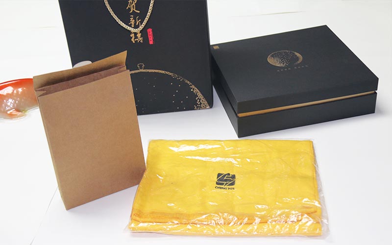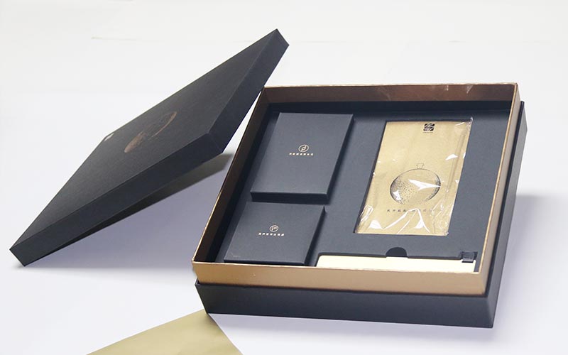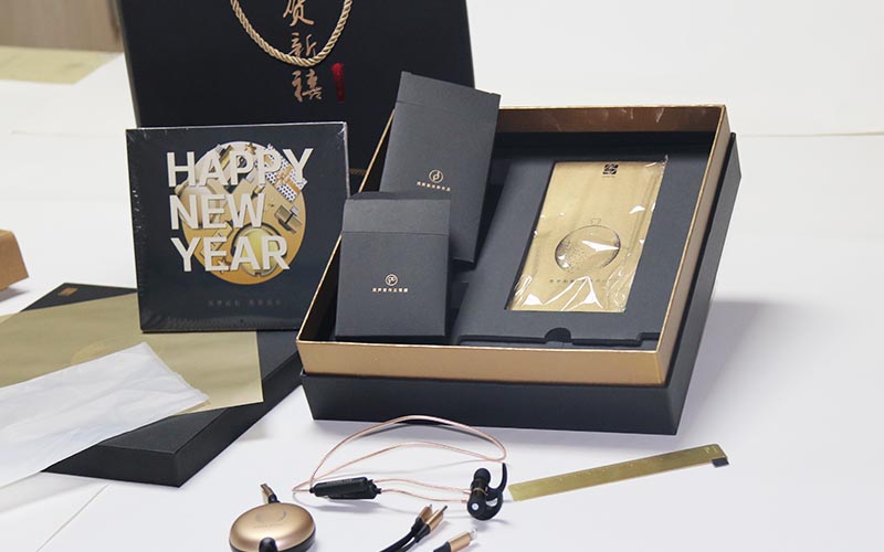 1.材質:這款是客戶套裝禮品包裝盒,袋子220G黑色 卡紙燙黃金+紅金,盒子外面紙用120G牛皮紙燙金裱1200G單黑闆,盒子内圍條用金色特種紙,底盒上盒材質一樣,盒型爲天地盒,小配件的都是350G黑卡紙燙金 ,還有一本木架支撐的單頁台曆,裏面還有一款金色的紅包特别豪華的感覺。最後是一個牛皮紙袋子裝圍巾,整款盒子制作都是手工配裝 。