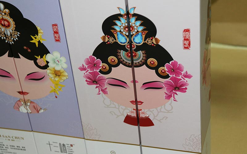 1.材質:盒子有兩個款式,兩款的材質也一樣,盒子面紙用157G銅版紙單面彩色印刷,盒子中間的人物局部UV光油,文字logo燙黃金和黑金 紅金三種色。盒子的上蓋結構最複雜,整款盒子都是純手工制作。