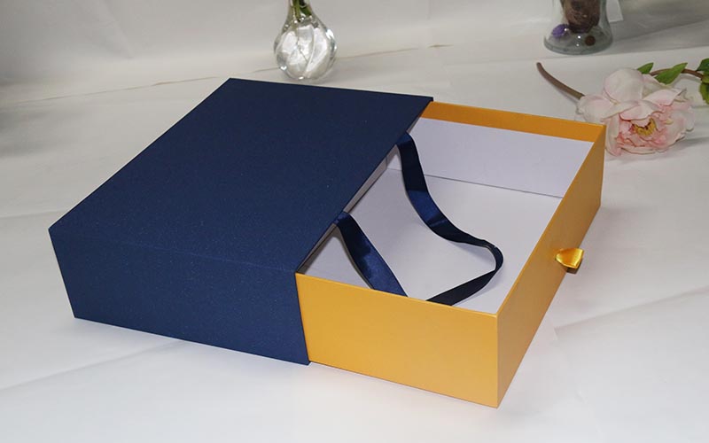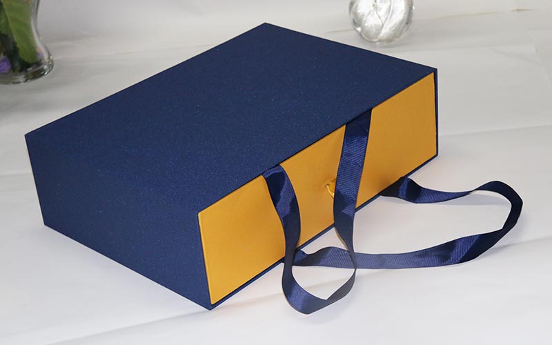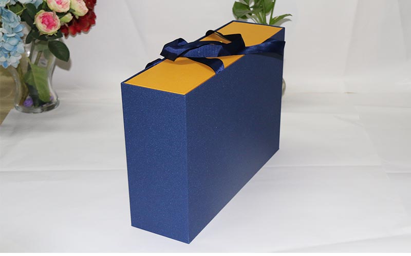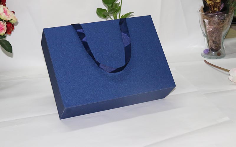 1.材質:盒子面紙用藍色磨砂特種紙,内盒也在用金黃色特種紙,裱1500G雙灰闆成品粘兩條絲帶方便客戶攜帶貨物,切記貨物太重的不能這樣。不然到時候繩子斷開産品就會受損,盒子比較大整款盒子都是手工制作 。