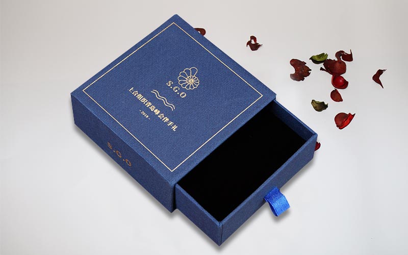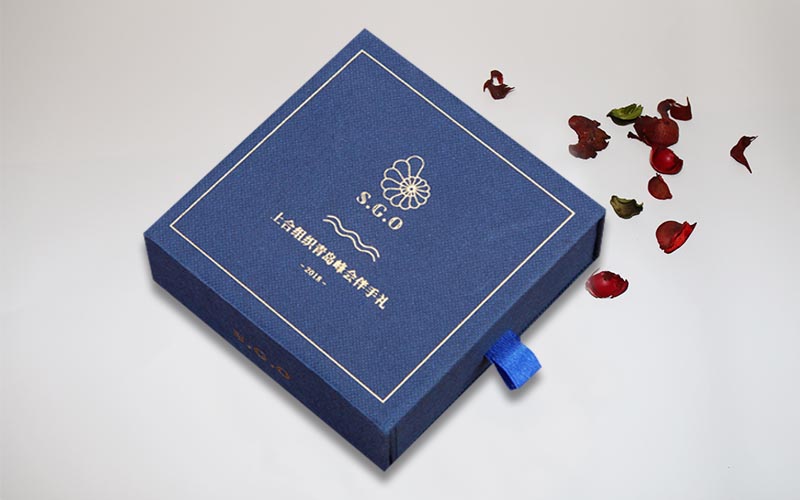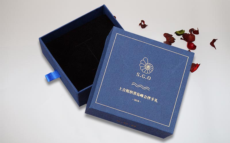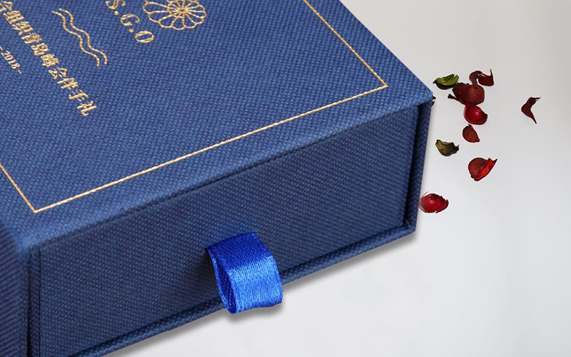 1.材質 :盒子面紙採用小石頭紋的藍色特種紙,盒子表面文字LOGO燙金色,裱1200G單白闆,整體盒子爲抽屜盒性,抽拉的地方裝藍色的絲帶。整款盒子手工制作。