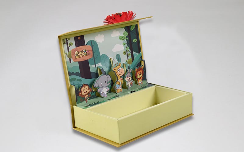 1.材質:盒子材質用157G銅版紙單面彩色印刷,單面覆亞膜,裱1500G雙灰闆,内托用350G單粉卡紙印刷裱350G單粉卡紙,裱内襯在襯紙上貼一張啤好模型立體的動物卡片,手工粘好定位,整款盒子手工制作成品。