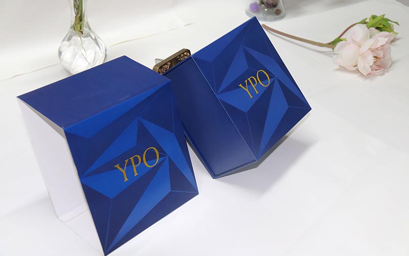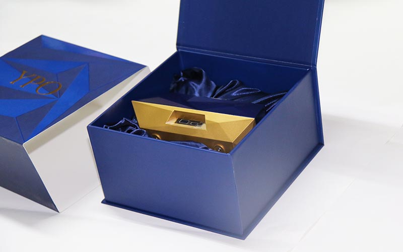 1.材質:盒子面紙採用157G銅版紙,單面覆亞膜文字LOGO燙金UV,裱1500G雙灰闆,盒子内托用珍珠棉裱一層專藍色綢布,盒型爲翻蓋磁鐵盒,外封套250G單粉卡紙,印刷,文字LOGO燙金,UV ,等工藝制作