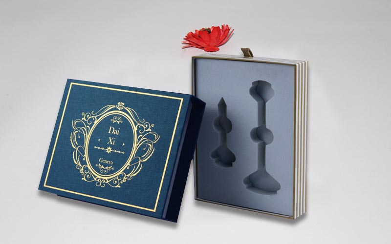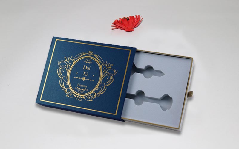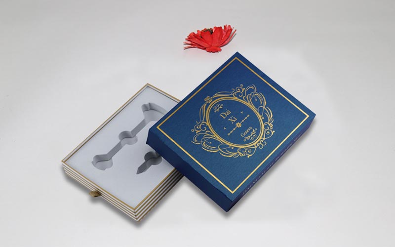 1.材質 :外盒子用藍色珠光紋路的特種紙,盒子面紙文案燙黃金,裱1200G雙灰闆,抽盒157G銅版紙彩色印刷啞膜,裱1200G雙灰闆,内托用白色EVA開V槽固定産品。整款盒子機械化制作。