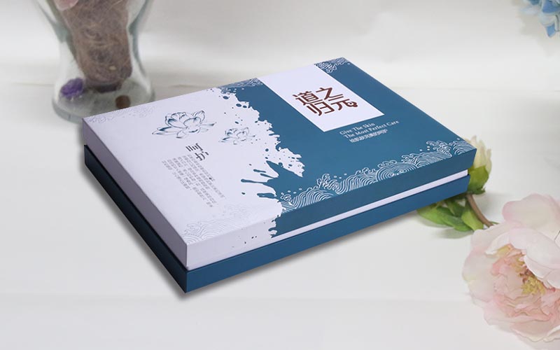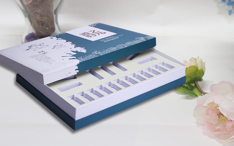 1.材質:盒子面紙採用白色珠光紙彩色印刷 ,裱1500G雙灰闆,下盒白色珠光紙藍色印刷裱1500G雙灰闆,中間純白色珠光紙裱1500G灰闆做圍條。内托用白色EVA,但是最重要的是盒子表面裱一層1MM厚度的海綿,盒子摸起來也會更有手感,整款盒子手工制作。