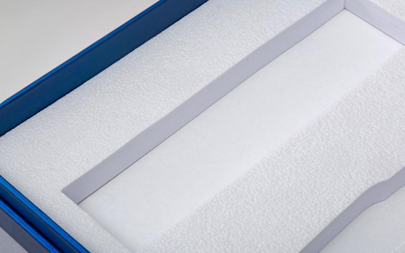 1.材質:1500g灰闆對裱藍色特種紙,内托採用瞭白色EVA植絨。工藝選擇瞭燙金跟uv工藝 。