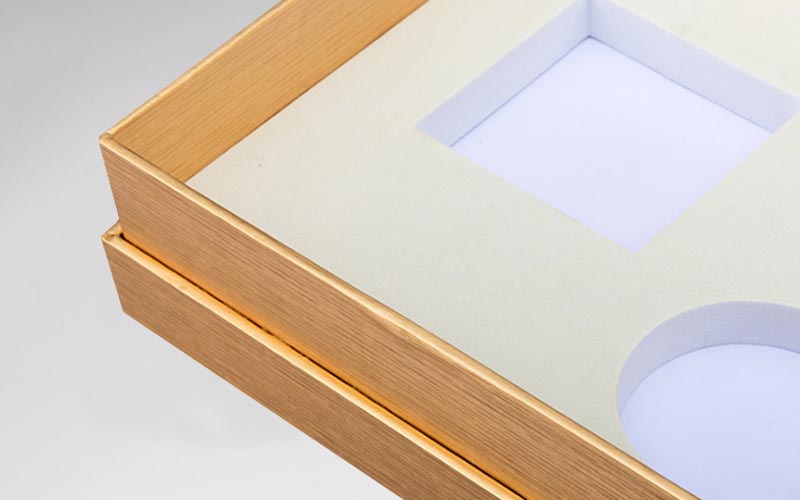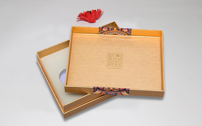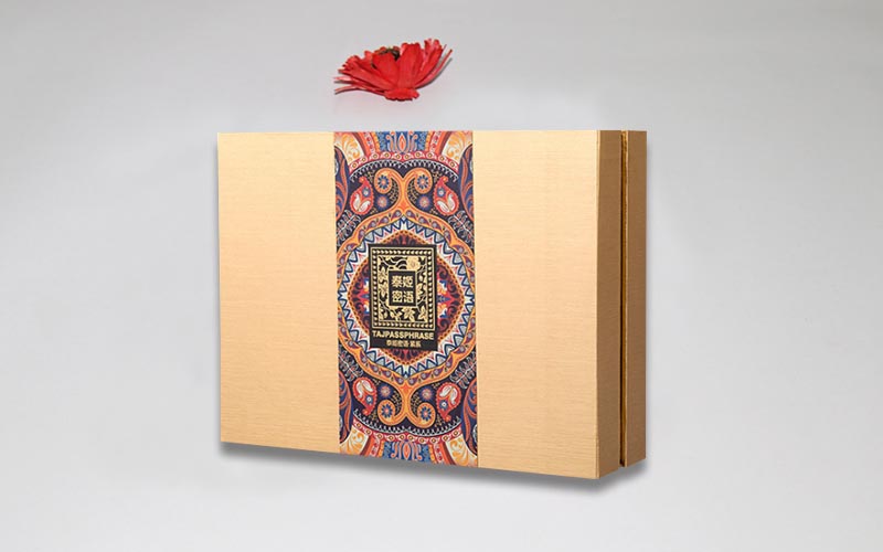 1.材質:盒子面紙用帶紋路的特種紙,表面在用銅版紙彩色印刷 ,花紋擊凸,UV等工藝,做成封條貼上去。裱1200G灰闆,盒型爲天地盒加中間内圍條,白色植絨EVA,開槽位固定産品。機器自動化制作。